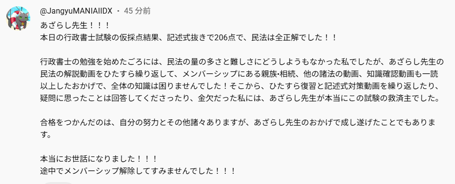 令和7年度行政書士試験を受験しましたが、解答速報にて自己採点を行ったところ、選択問題で178点を取り、記述についても明らかに2点以上得点をしていたので、合格は確実と思います。寂しいですが、これを機にアザヨビを卒業させていただきたく存じます。